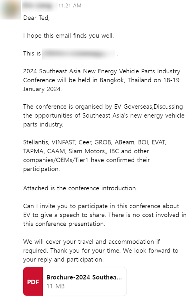 초대받은 곳은 다름아닌 1월 18일~19일, 이틀간 태국의 방콕에서 진행되는 EV Goverseas가 주최하는 Conference 2024 동남아시아 신에너지 자동차 부품 산업 컨퍼런스(2024 Southeast Asia New Energy Vehicle Parts Industry Conference, SA NEVPI Conference)였습니다.